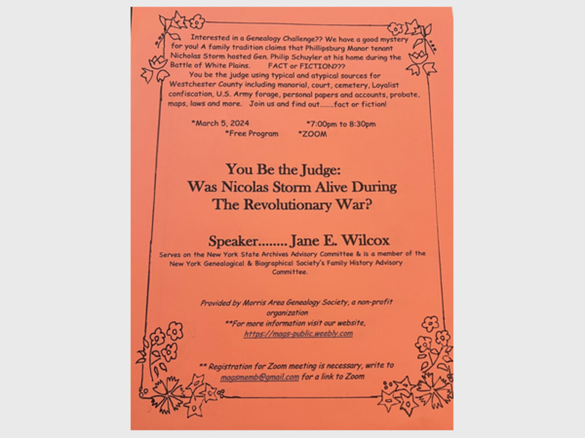 The Morris Area Genealogy Society will be hosting an online presentation by Jane E. Wilcox titled "You Be the Judge: Was Nicholas Storm Alive During the Revolutionary War?" on March 5, 2024 at 7:00pm. Email magsmemb@gmail.com to get the zoom link.
