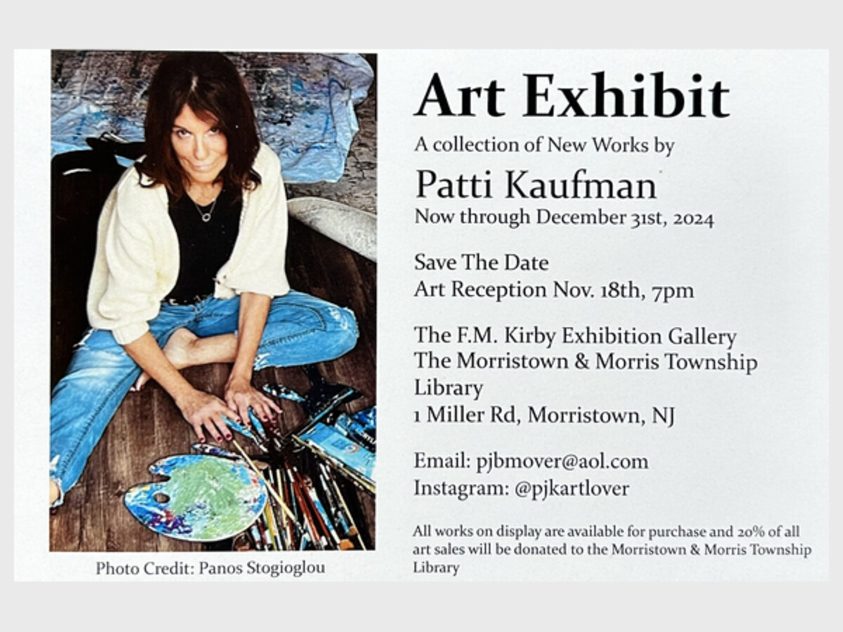 Join Patti Kaufman, local Artist for her Art Reception on November 18th, 7pm. She will be speaking about her journey as an Artist and how her Art has given her the opportunity to advocate and help non profits. All works will be on display thru December. 20% of all art sales will be donated to The Morristown & Morris Township Library.
