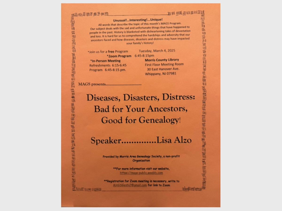 Join the Morris Area Genealogy Society for an in person or zoom meeting titled "Diseases, Disasters, Distress: Bad for Your Ancestors, Good for Genealogy!" presented by Lisa Alzo. Come to the Morris County Library in Whippany on Tuesday 3/4/25 from 6:45-8:15pm or email MAGSGenNJ@gmail.com for the zoom link.