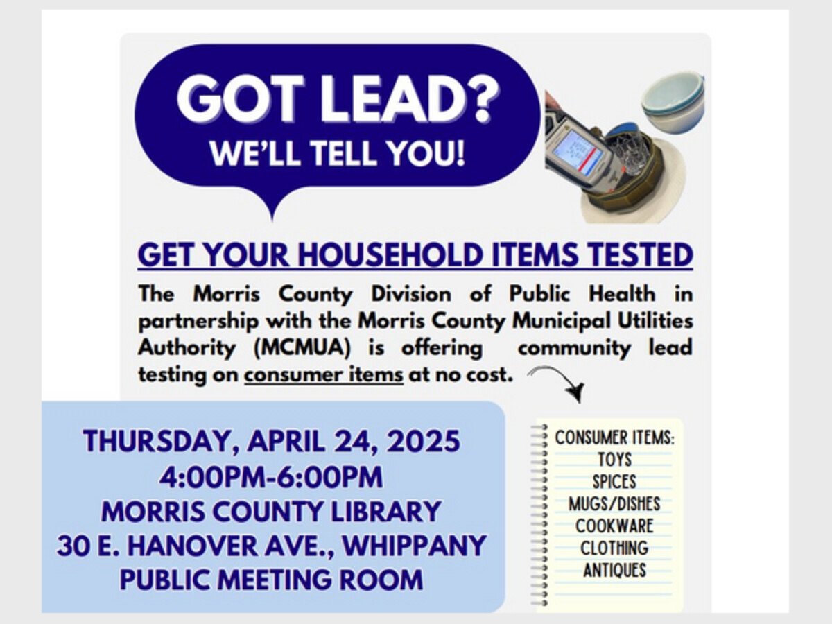 The Morris County Division of Public Health in partnership with the Morris County Municipal Utilities Authority (MCMUA) is offering community lead testing on consumer items at no cost.