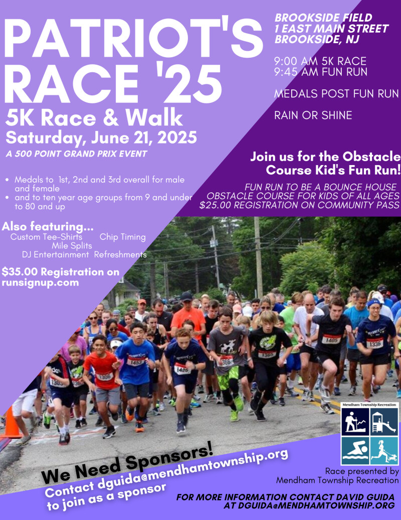 Patriots Race: There's still time to register for the Patriot's 5K Race! On Saturday, June 13, run or walk with friends and family while also giving back to the community. If you're not able to race, consider volunteering at one of our rest stations. Registration and Race Day details can be found at Mendham's Annual Patriots Race Day page.