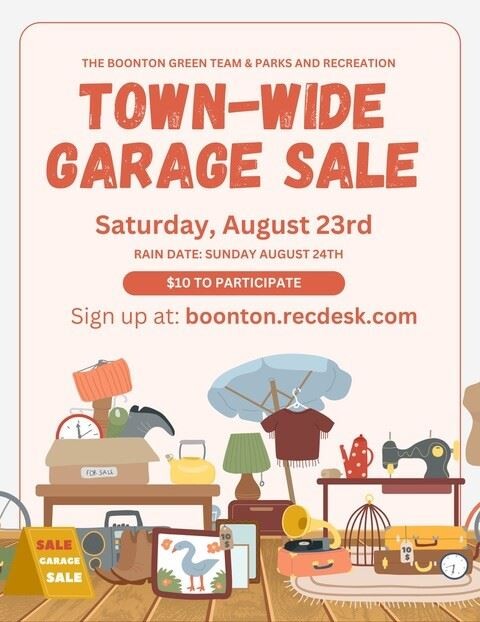 The Boonton Green Team and Parks & Recreation will host a Town-Wide Garage Sale at multiple residences around the town of Boonton on Saturday, August 23, 2025.