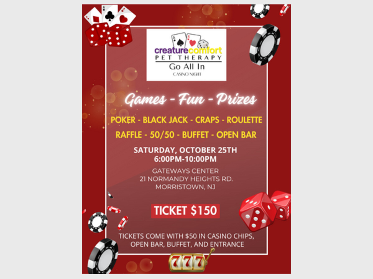 Creature Comfort Pet Therapy is inviting the community to take a gamble for a great cause at this year’s Go All In Casino Night taking place on Saturday, October 25, 2025 from 6:00 PM to 10:00 PM at the beautiful Gateways Center at 21 Normandy Heights Road, Morristown, NJ.This exciting evening will feature casino-style games, additional games of chance, a 50/50 raffle, buffet dinner, wine/beer open bar, and a night filled with fun chances to win high-end prizes — all to support Creature Comfort Pet Therapy’s mission of bringing comfort, joy, and healing through pet visits. Guests will also have the opportunity to meet some of the organization’s calm, loving therapy animals.Tickets are $150 per person, which includes a $50 casino chip to get the fun started. Proceeds from the event will help fund thousands of annual visits by certified therapy animals to hospitals, nursing homes, rehabilitation centers, schools, and other community locations across nine New Jersey counties.