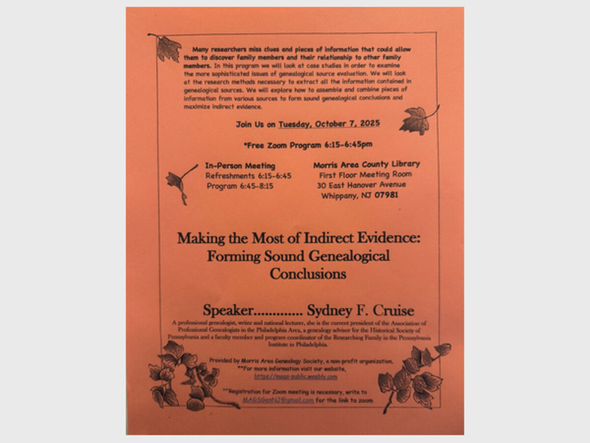 The Morris Area Genealogy Society presents "Making the Most of Indirect Evidence: Forming Sound Genealogical Conclusions" by speaker Sydney F. Cruise. The meeting will be held in person on Tuesday 10/7/25 from 6:15-8:15pm at the Morris Area County Library, 30 East Hanover Ave, Whippany and also on Zoom. For the zoom link please email MAGSGenNJ@gmail.com.