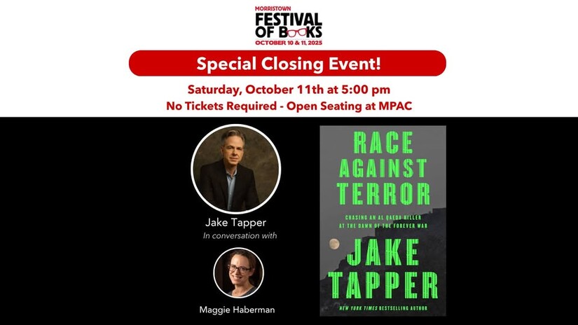 The Morristown Festival of Books is thrilled to welcome back Jake Tapper, the lead Washington, D.C., anchor and chief correspondent for CNN.Join us for a special Closing Event on Saturday, October 11th at 5:00 p.m. Tapper, the author of several bestselling novels and nonfiction books, will be joined in conversation by journalist Maggie Haberman of CNN and The New York Times.This special event, which includes a Q&A session, will take place at the Mayo Performing Arts Center (MPAC) in Morristown. Pre-signed copies of Tapper’s new hardcover, RACE AGAINST TERROR, will be available for purchase at the venue and all day in the Festival Book Tent.There are no tickets required and there is open seating at MPAC.