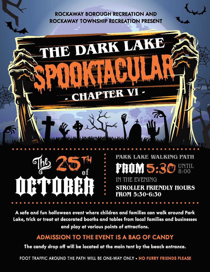 The "Dark Lake Spooktacular" is a free trick-or-treat event hosted by the Rockaway Boro Recreation and Education Foundation on the Park Lake walking path in Rockaway, NJ, where families and businesses set up decorated tents to give out candy to children. For the 2025 event, it is scheduled for October 25, 2025, from 5:30 PM to 8:00 PM.