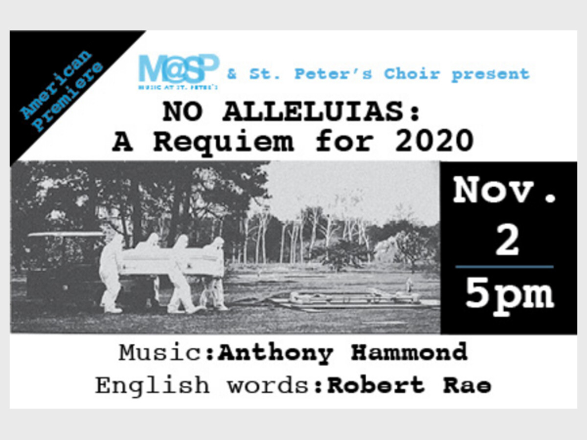 Music at St. Peter's is thrilled to present the American premiere of No Alleluias: A Requiem for 2020 - commissioned by the Edinburgh Just Festival and written by Morristown's own Anthony Hammond to commemorate lives lost during the pandemic and honor caregivers everywhere.
