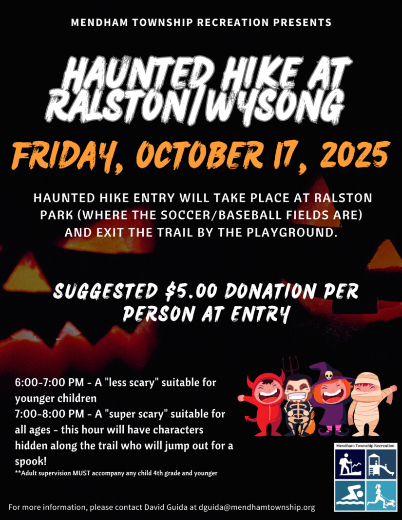 On Friday, October 17, 6:00 p.m. - 8:00 p.m., Ralston Park (where the soccer/baseball fields are) - Mendham Township Recreation invites you to a Halloween Haunted Hike! Join us for a family friendly & spooky evening.
