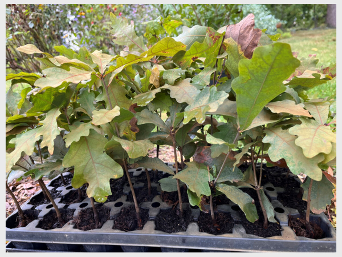 White oak was the species chosen because it is suitable for the light and soil conditions at this site, and because oaks are a keystone species—providing critical habitat resources for the ecosystem. Oaks not only produce acorns that feed birds, squirrels, and other wildlife, they are a host plant for 513 species of butterflies and moth caterpillars in our area.