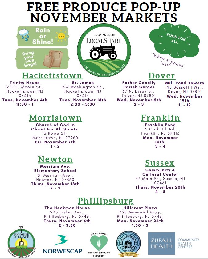 Due to the government shutdown and resulting loss of SNAP Benefits, several locations will be hosting Free Produce Pop-Up Markets in various locations around Morris County and New Jersey. These markets will happen rain or shine. Bring your own bag. Food is free to all as long as supplies last. Please let those who need this service most receive priority. See below for times and other locations.