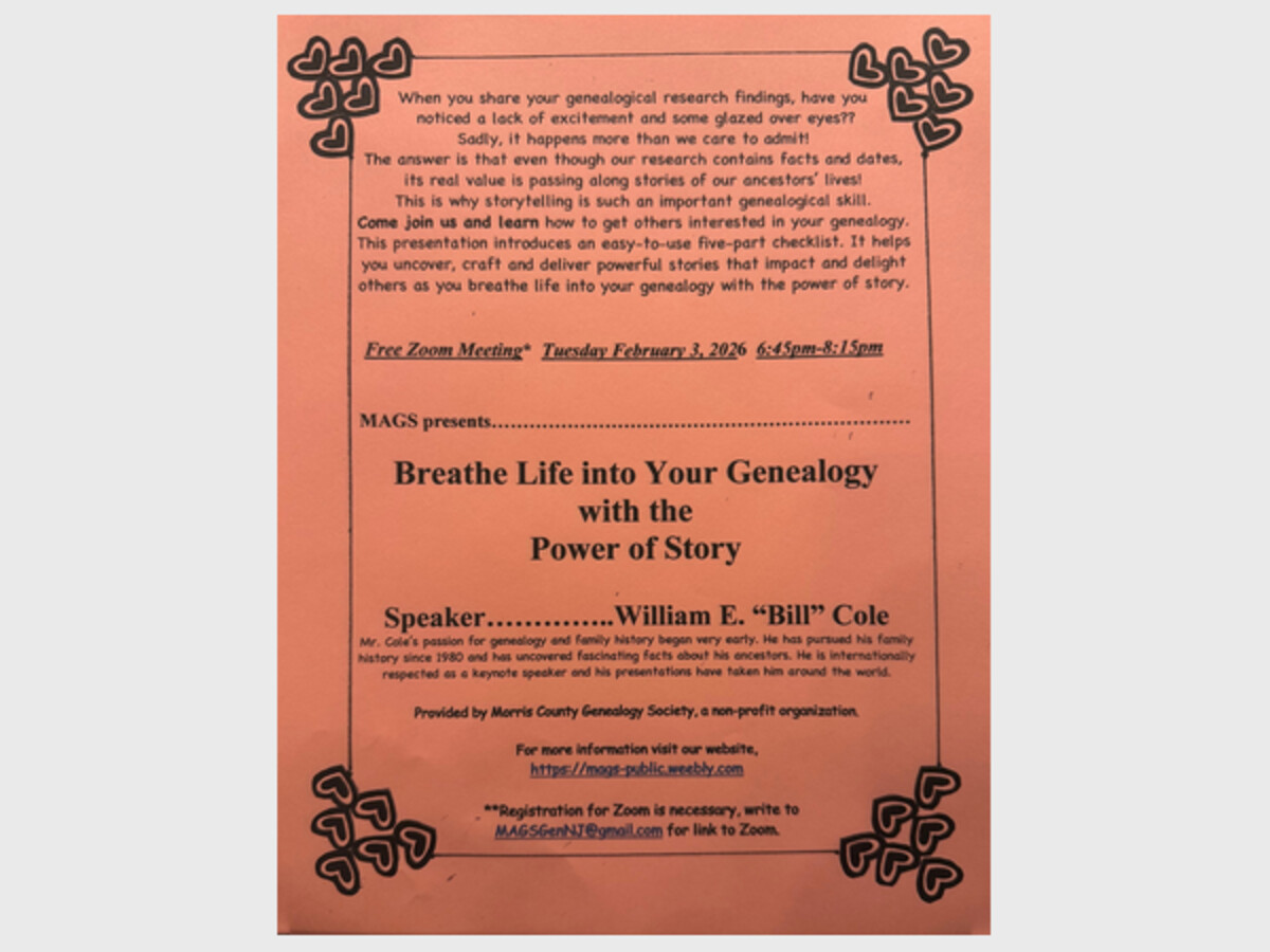 The Morris Area Genealogy Society presents "Breathe Life into Your Genealogy with the Power of Story" by William E. "Bill" Cole. This will be a zoom presentation on Tuesday, February 3, 2026 from 6:45-8:00pm. To receive the zoom link please email MAGSGenNJ@gmail.com.