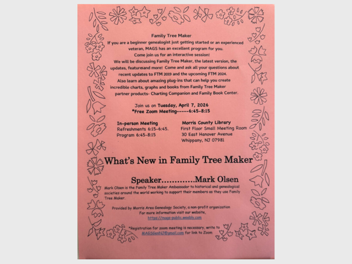 The Morris Area Geneaology Society will host their monthly meeting and present "What's New in Family Tree Maker" by Mark Olsen on Tuesday, April 7, 2026. The presenetation will be from 6:45-8:15pm in person at the Morris County Library, 30 East Hanover Ave, Whippany, NJ and on Zoom. Join for refreshments from 6:15-6:45pm. If you would like the Zoom link please email MAGSGenNJ@gmail.com.