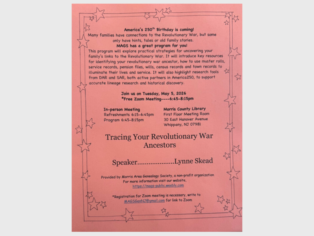 In honor of America's semiquincentennial, The Morris Area Genealogy Society presents "Tracing Your Revolutionary War Ancestors" by Lynne Skead. This program will be offered in person and on Zoom on Tuesday, May 5, 2026 from 6:45 to 8:15pm at the Morris County Library, 30 East Hanover Avenue, Whippany, NJ 07981. Come early from 6:15-6:45pm for refreshments. To get the zoom link please email MAGSGenNJ@gmail.com.