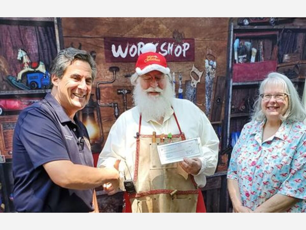 Bob and Pamela Smith – our Mr. & Mrs. Claus – were at their “Big Red Santa” workshop to greet Commissioner Stephen Shaw as he delivered the check.