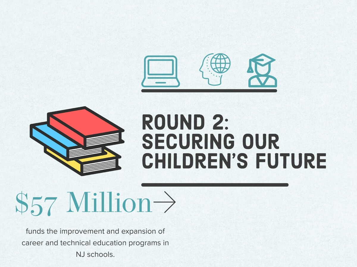 The second round of grants will total nearly $57 million and be distributed by the New Jersey Department of Education (DOE) and the Office of the Secretary of Higher Education (OSHE). Funds will be disbursed on a rolling basis contingent on final grant revisions and recipient submission of reimbursement requests.