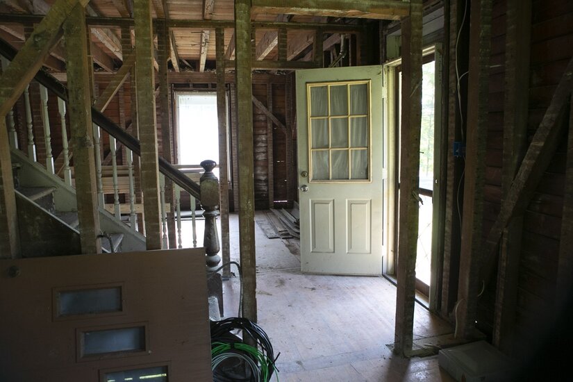 The current project involves restoration of the exterior, including masonry repair and repointing work at the foundation and repairs to the wood siding and trim. The project also includes the replacement of windows and doors.