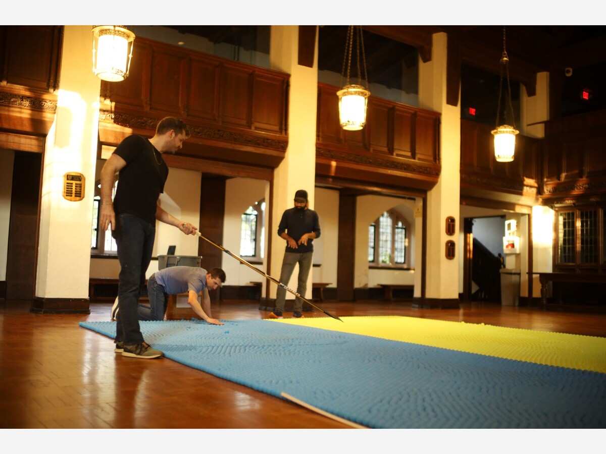 St. Peter’s was kind enough to allow the three friends to use their spacious facility for a long six-hour day on Sunday, October 9th, to assemble the massive Ukrainian ping pong flag.