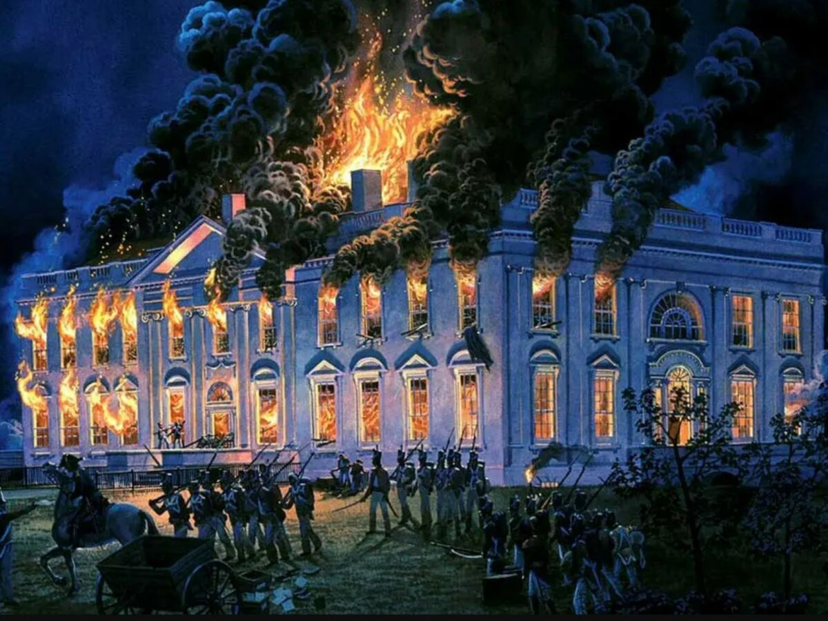 John Archibald Woodside, 1814. National Portrait Gallery, Smithsonian. In his painting, Mr. Woodside reflected on one of the issues leading up to the war by illustrating freedom from tyranny on the seas, known as “Impressment”. Note the crushed crown under the sailor’s foot near a broken chain. Columbia is shown with the maritime red flag signaling an intention to give battle with no quarter, in other words, fight to the death. She holds aloft a laurel wreath, the traditional emblem of victory.On August 24, 1814, British troops set fire to an undefended Washington D.C., marking the first and only occupation of an American capital by a foreign power since the American Revolution. As the United States grappled with its nascent national identity, the War of 1812 played a critical role in unifying its people.