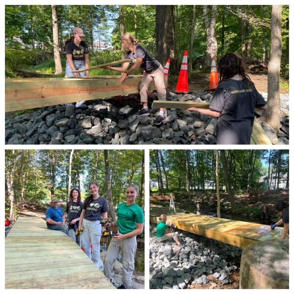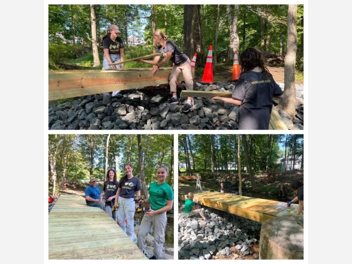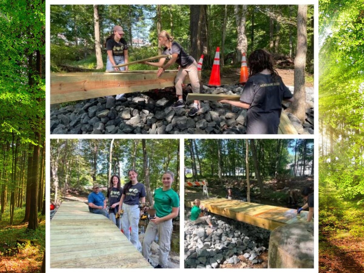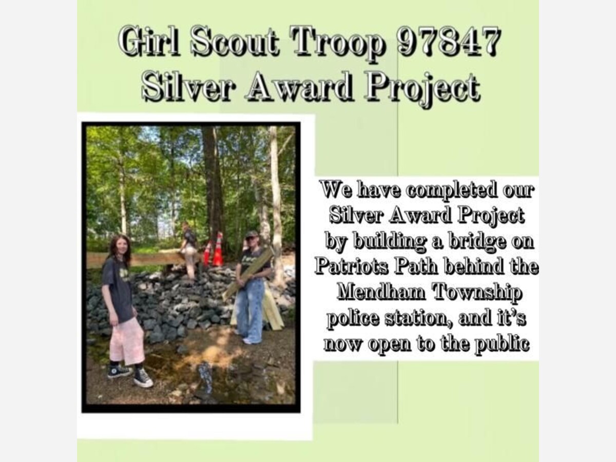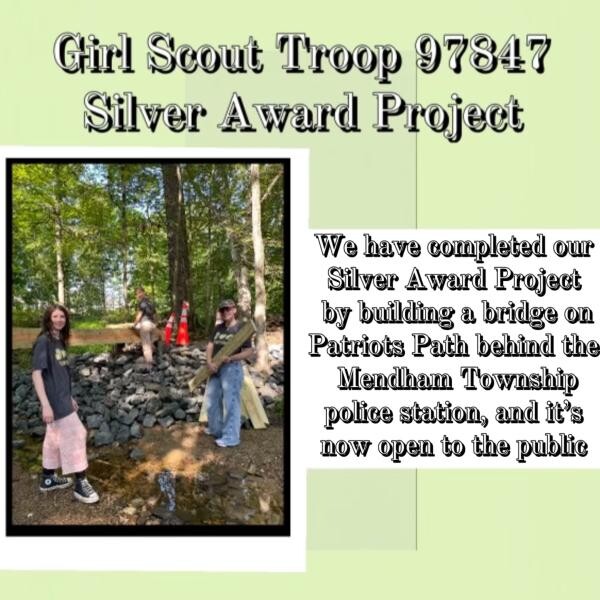 MENDHAM TWP, NJ - Girl Scout Troop 97847 of Mendham Township, composed of three dedicated eighth graders from Mendham Township Middle School, recently completed their Silver Award project, “Bridge for the Better.” The project, designed to improve access and promote outdoor activities, entailed constructing a new bridge on Patriot’s Path behind Mendham Township Elementary School, reconnecting a trail that had been inaccessible due to the collapse of a previous bridge. This addition now enables students, hikers, bikers, and community members to safely cross the river without navigating through water.