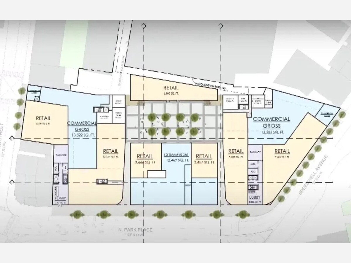 Credit: MHS ArchitectureThe plan involves demolishing two large buildings, including the former Century 21 department store, to construct two five-story mixed-use structures. The new development will include 160 residential units—15% of which will be designated as affordable housing—along with 144,000 square feet of office space and 44,000 square feet of ground-floor retail. Additionally, the site will feature a 15,000-square-foot courtyard designed as a community gathering space, accessible via pedestrian corridors from North Park Place and the Dalton parking garage on Cattano Avenue. The existing five-story building at 10 North Park Place will remain and will be enhanced with new walkways.