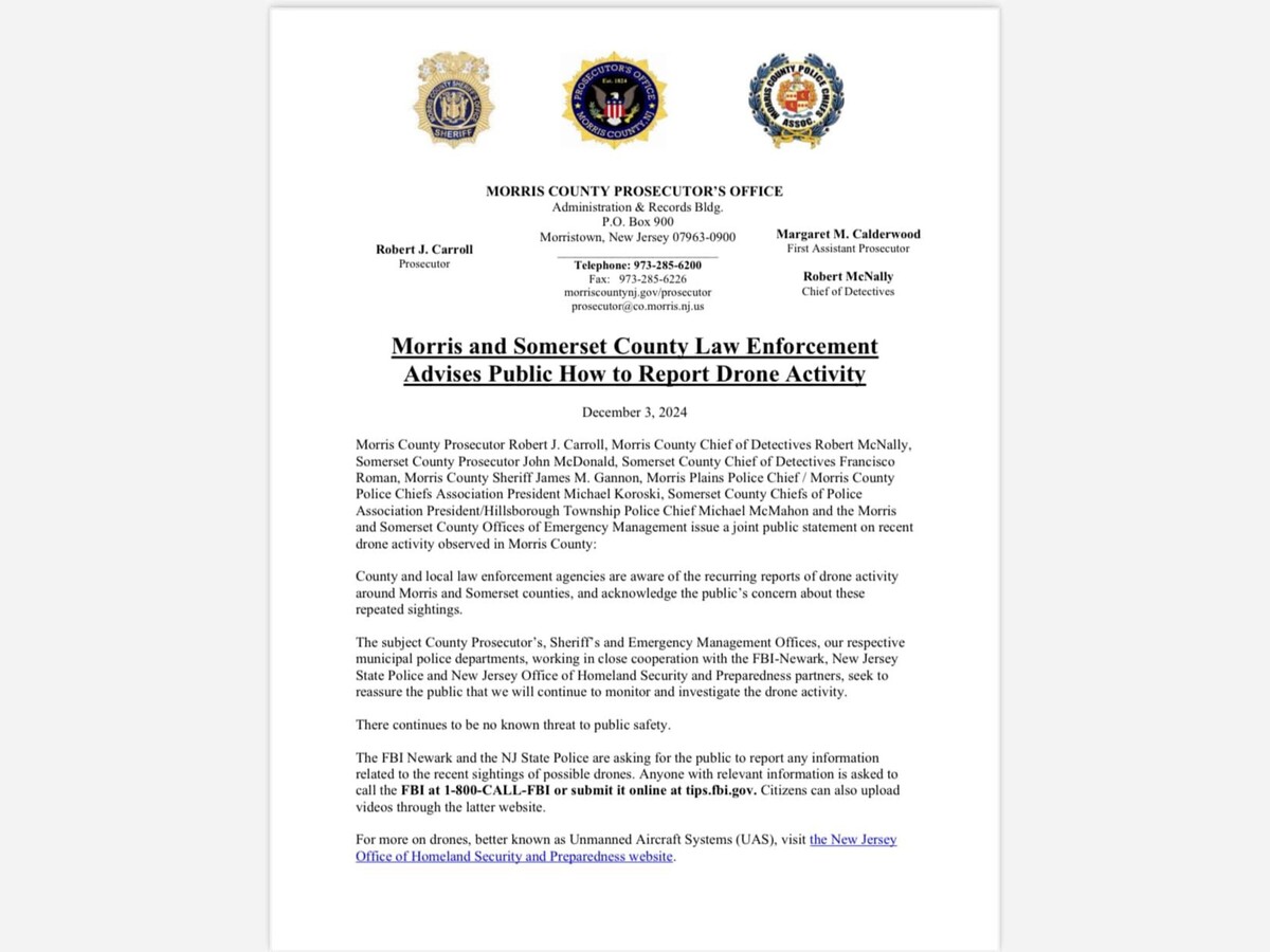 "The FBI - Newark and the NJ State Police are asking for the public to report any information related to the recent sightings of possible drones. Anyone with relevant information is asked to call the FBI," reads a press release from the Morris County Prosecutor's Office.
