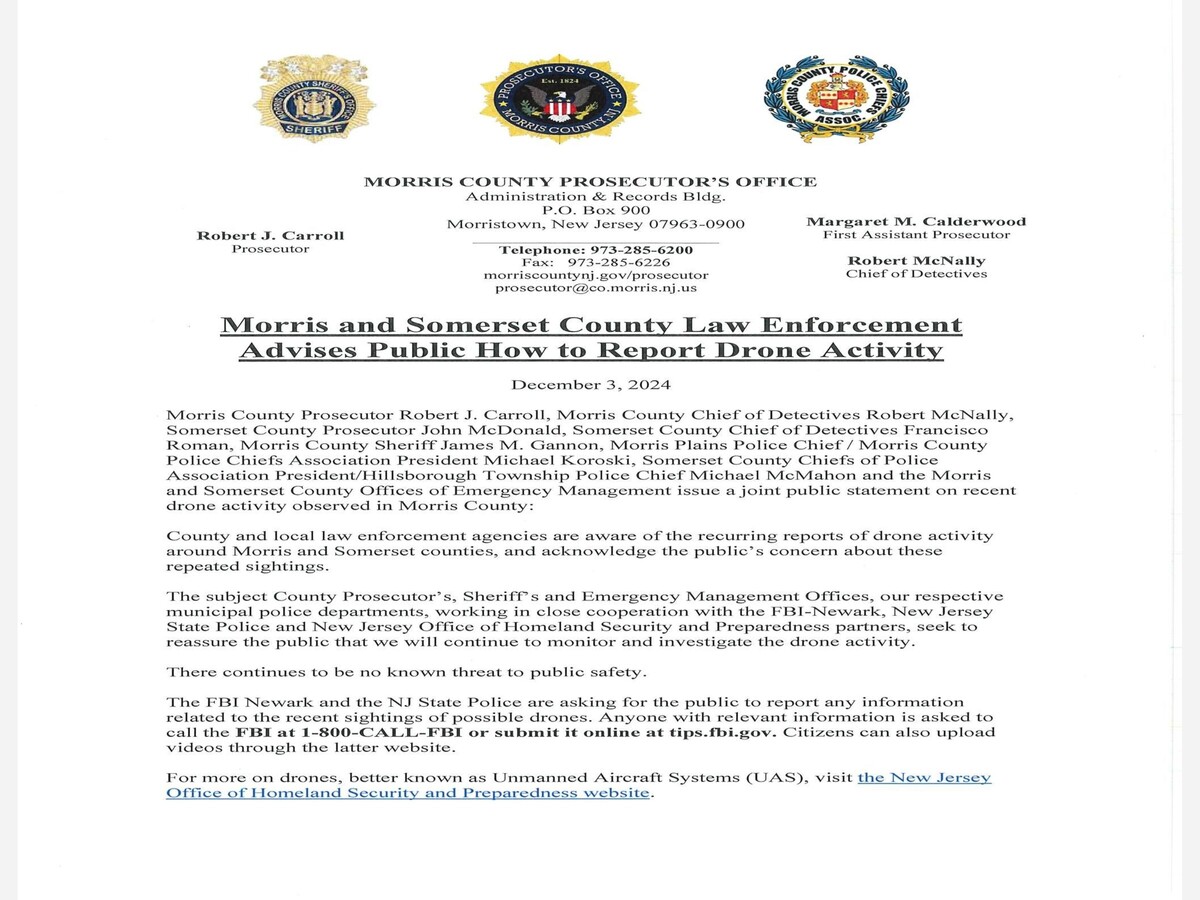 You may have observed or become aware of the various reported drone sightings, in the airspace above Morris County, in recent weeks. Morris County law enforcement, in conjunction with our State and Federal partners, have been attempting to determine the launch point and landing location of these drones, as well as the people or entities responsible for their presence in our airspace. Several drone sightings have been reported above critical infrastructure such as water reservoirs, electric transmission lines, rail stations, police departments and military installations. Members of the local law enforcement community have been pressuring our partners for answers regarding this activity as their presence around our critical infrastructure is concerning. While we currently have no evidence or information to indicate these drones pose an imminent threat at this time, their presence appears nefarious in nature.