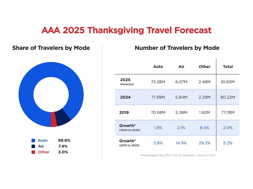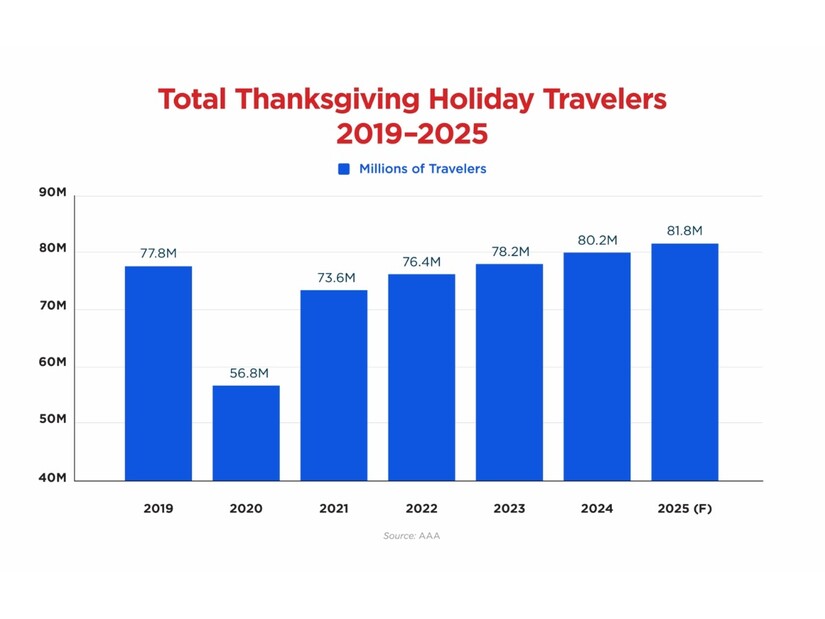 Source AAAAccording to AAA’s 2025 Thanksgiving Travel Forecast, approximately 81.8 million Americans are expected to travel 50 miles or more between Tuesday, November 25, and Sunday, December 1. This represents a 2.5% increase over 2024 and marks the third-highest Thanksgiving travel volume since tracking began in 2000.