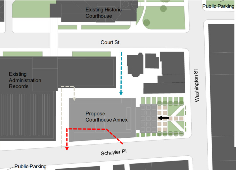 The project is expected to take about 24 months and will add an eight-story criminal courthouse facility on an open-air parking lot and part of an adjacent pocket park along Schuyler Place, according to the county. The new building is planned to include eight new courtrooms, jury assembly areas, and judge chambers, along with a new main entrance to the courthouse complex and the County Administration and Records Building at the corner of Washington Street and Schuyler Place.