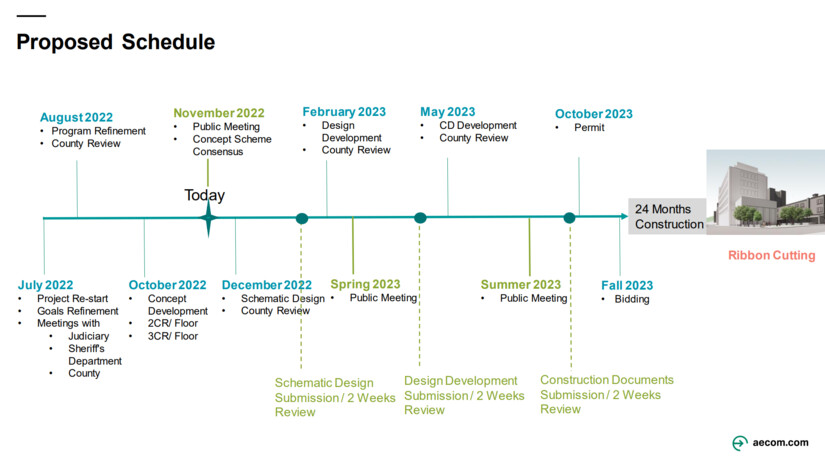 County materials from 2022 similarly describe a courthouse “annex” with a gross floor area of roughly 117,000 square feet and a construction timeline of about 24 months.