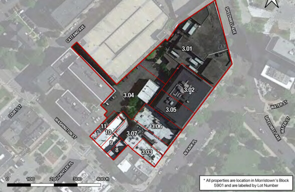 The redevelopment area covers a cluster of parcels at the heart of downtown, immediately adjacent to the Morristown Green. Town planning documents identify the site as Block 5901, Lots 8, 9, 10, 11, 3.01, 3.02, 3.03, 3.04, 3.05, 3.06, and 3.07, a footprint the town has described as suffering from vacancies and deteriorating conditions despite surrounding reinvestment downtown.