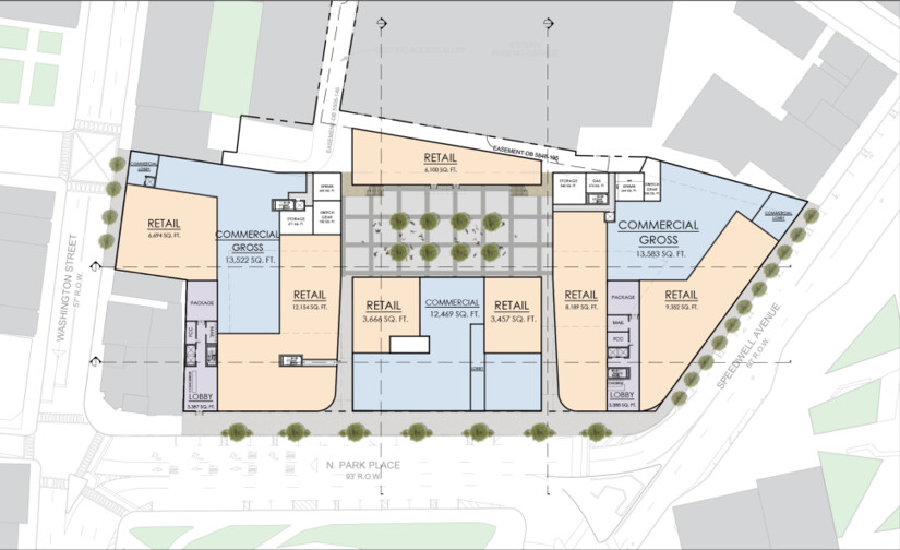 Ground floor concept plan via MHS ArchitectureIn prior concept materials described publicly, the redeveloper’s vision has been framed as a mixed-use project combining housing, office space, and ground-floor retail on and around the currently vacant storefronts.