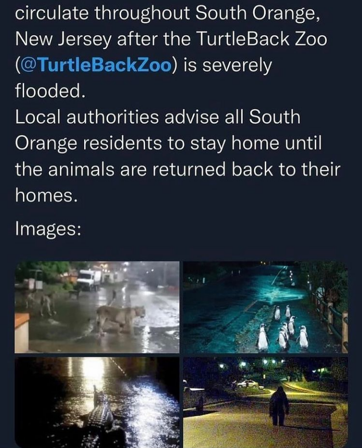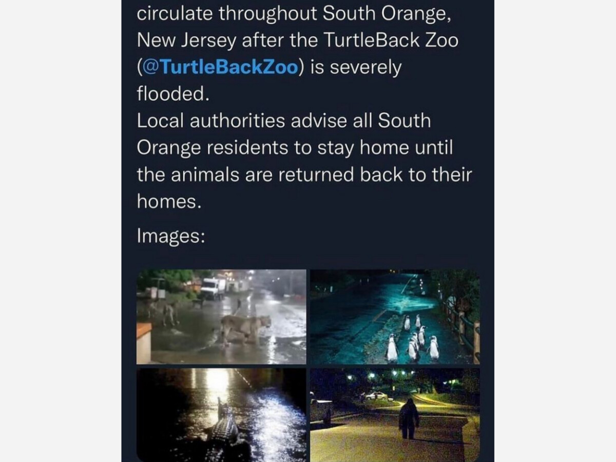 An online social media post, not long after Ida left its mark, claimed that animals, lions, tigers, bears (oh my) had escaped from the Turtle Back Zoo and were roaming the streets of South Orange. The false claim originated from a Twitter account impersonating CNN, "Breaking: Reports of escaped animals circulate throughout South Orange, New Jersey after the TurtleBack Zoo (@TurtleBackZoo) is severely flooded. Local authorities advise all South Orange residents to stay home until the animals are returned back to their homes.”