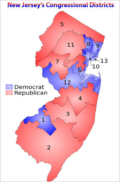 New Jersey’s 12 US representatives and 120 state legislators are elected from political districts which are redrawn every ten years based on US census results. Districts are required to have nearly equal populations and not discriminate based on race or ethnicity.