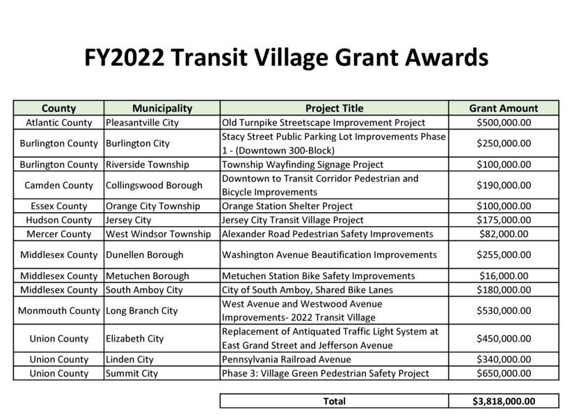 Governor Murphy and Department of Transportation Commissioner Diane Gutierrez-Scaccetti announced on January 31st a $3.8 million investment in "Transit Village grants" for the fiscal year 2022.