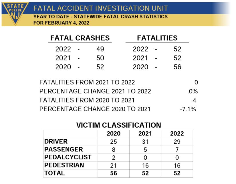 New Jersey State Police, Fatal Accidents, January 2020-22