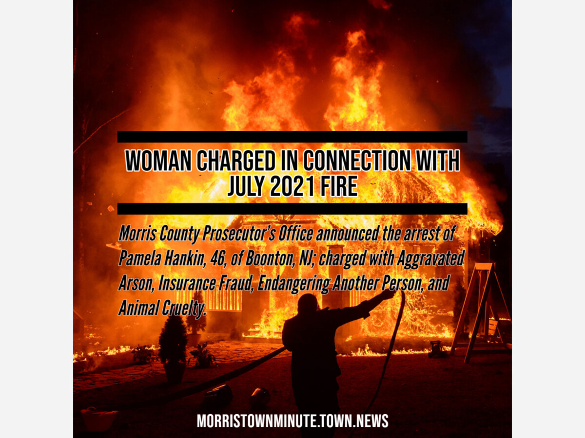 Morris County Prosecutor’s Office announced the arrest of Pamela Hankin, of Boonton, NJ, in connection with a residential fire that occurred on July 14, 2021, on Prospect Avenue. She’s been charged with Aggravated Arson, Insurance Fraud, Endangering Another Person, and Animal Cruelty.