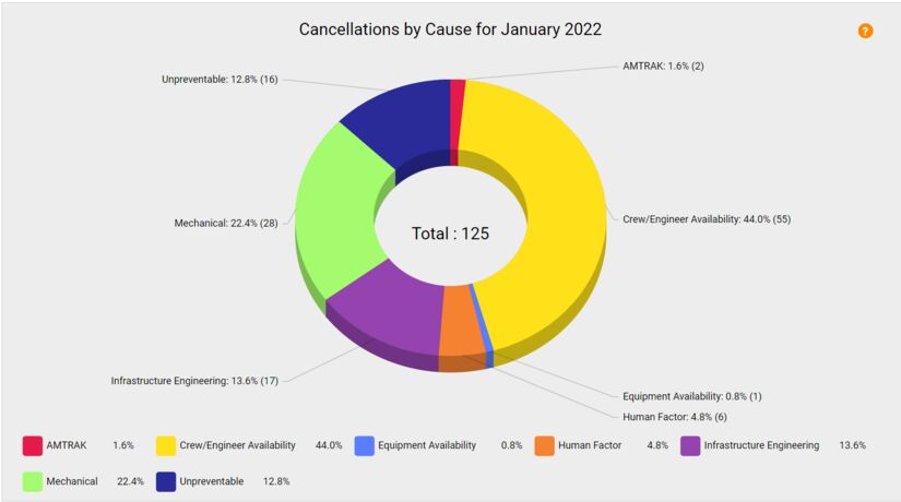 Of all cancellations in January, only 12.8% (16 out of 125 canceled trips) were unpreventable. If the M&E Line were running as efficiently as realistically possible, the lines cancellation rate would be near that 12.8% figure.