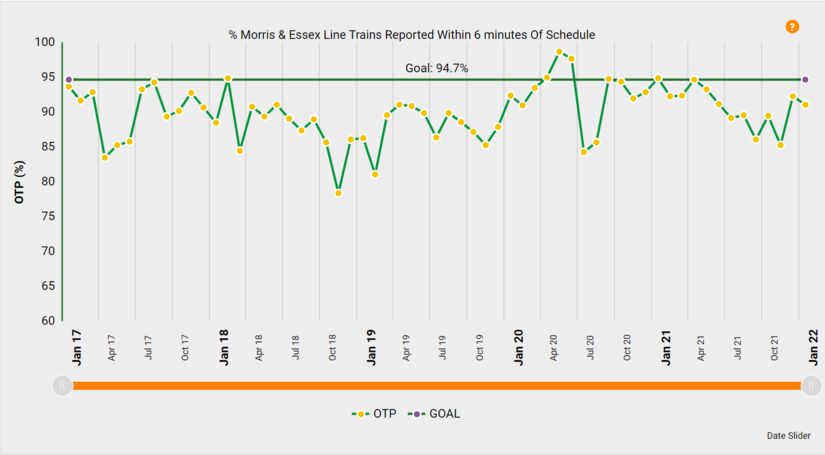 Since January 2017, the Morris-Essex line of New Jersey Transit has aimed for a goal of 94.7% of on-time arrival and departures.