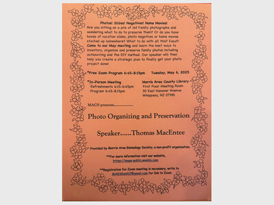 Morristown event Tue Sep 2 6:45 pm Genealogy meeting The Morris Area Genealogy Society will be hosting an in-person and zoom meeing on Tuesday 9/2/2025 at the Morris Area Co Carole Flatley Morristown Minute
