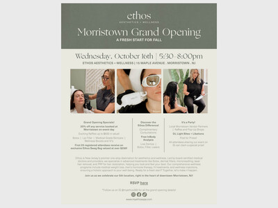 Morristown event Wed Oct 16 5:30 pm Ethos Aesthetics + Wellness - Morristown Grand Opening Join us for a FREE & exciting evening of beauty & wellness, packed with exclusive perks you won't want to miss! Maggie Davis Skora Morristown Minute