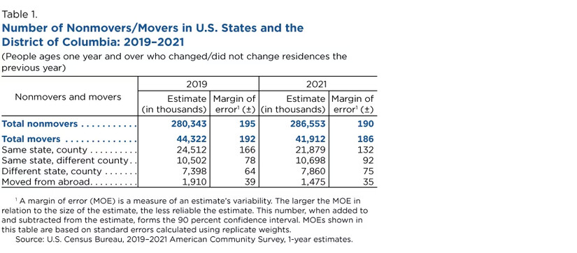 While the total mover rate has declined, the decrease appears to be primarily tied to a drop in the number of people making same-county moves, which was the largest category, with roughly 25 million in 2019 and about 22 million in 2021, as reported in Table 1.