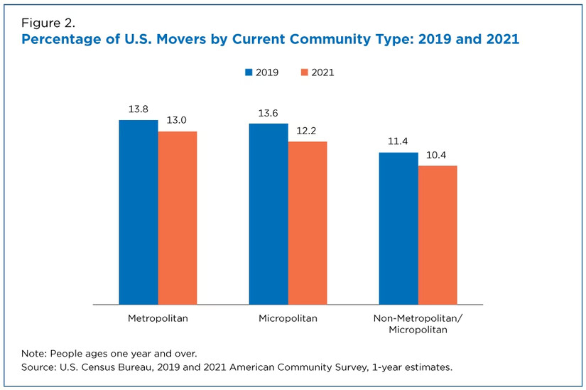 - The share of movers residing in metro areas in 2019 dropped from 13.8% to 13.0% in 2021 (as shown in Figure 2).