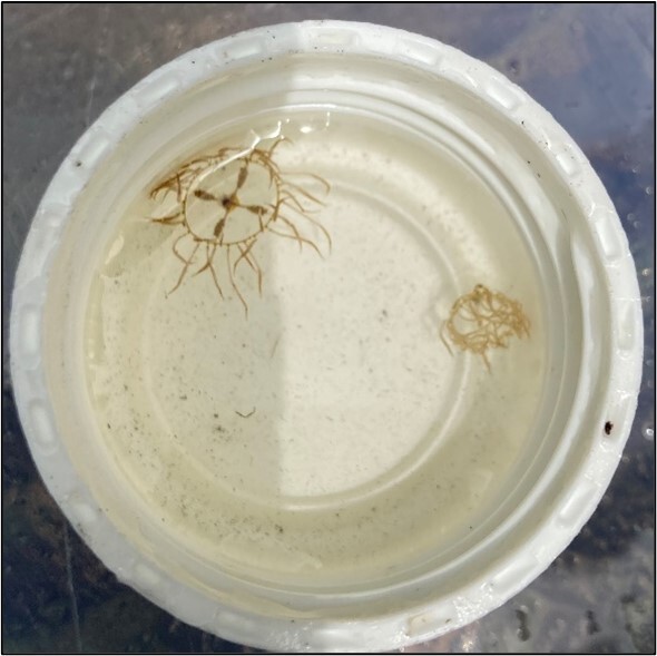 These jellyfish, whose size ranges between a dime and a quarter, are identified by a distinctive reddish-orange to yellowish cross within their translucent bodies.