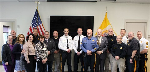 Group photo of MCCF staff (right) and ACA staff (left). Sheriff Gannon is standing sixth from the right (the yellow Morris County flag is behind him).