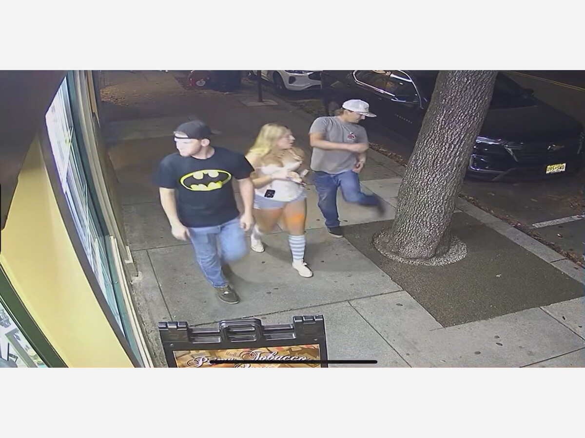 According to authorities, on November 2, 2024, at approximately 12:25 AM, an unknown white male was observed on surveillance video picking up and walking away with a plastic A-frame sign taken from out front of Prime Tobacco Zone Smoke Shop at 45 South Street, Morristown, NJ. The suspect, caught on video, stumbles into a neighboring storefront, eyes the sign, and picks up and walks away with it continuing to stumble and appearing to be intoxicated. The suspect was wearing a baseball cap, a black t-shirt with the "Batman" logo on it, blue jeans, and dark/brown boots with white soles. After removing the sign the suspect stumbles down South Street toward Community Place. The suspect traveled with two other people, a man and a woman. Video captures can be seen below.