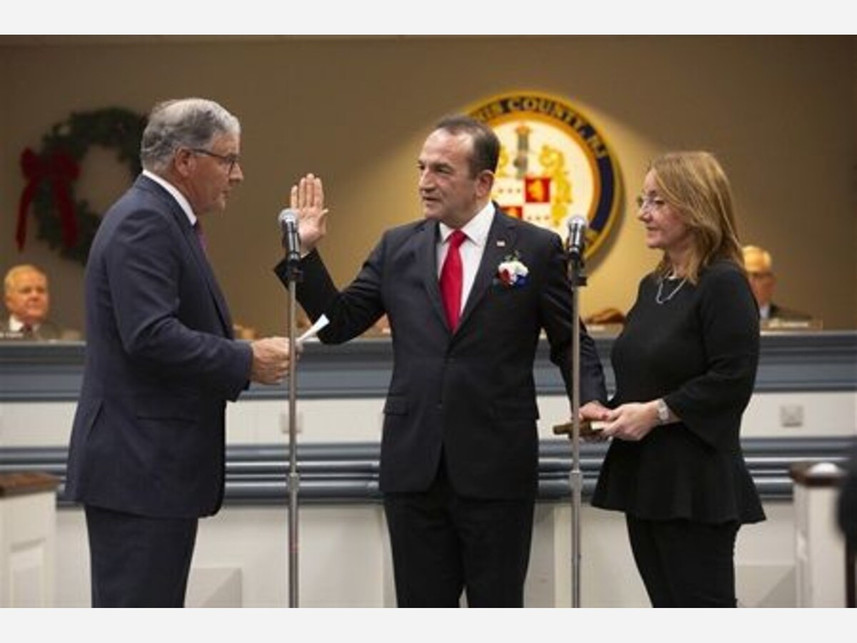 Commissioner Krickus emphasized his dedication to veteran services and fiscal discipline as he was sworn in by Assemblyman Michael Inganamort. Krickus’s wife, Carolyn, held the Bible.