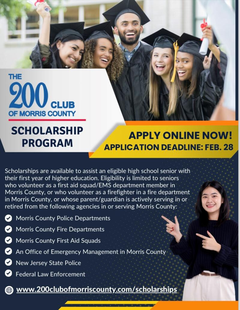 The 200 Club of Morris County scholarship program offers assistance to eligible high school seniors for their first year of higher education. Eligibility is limited to seniors who volunteer as a first aid squad/EMS department member in Morris County, or who volunteer as a firefighter in a fire department in Morris County, or whose parent/guardian is actively serving in or retired from the following agencies in or serving Morris County: