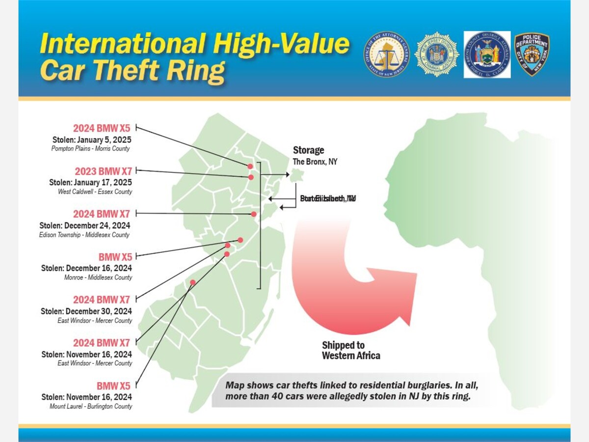 The charges stem from a collaborative investigation involving law enforcement agencies in New Jersey and New York. Authorities say the organized criminal enterprise targeted high-end vehicles—including BMWs, Mercedes-Benzes, Audis, and Land Rovers—stolen primarily from residences in Morris, Essex, Mercer, Middlesex, and Burlington counties. Vehicles were then concealed in parking garages in the Bronx before being loaded into shipping containers bound for countries such as Ghana.