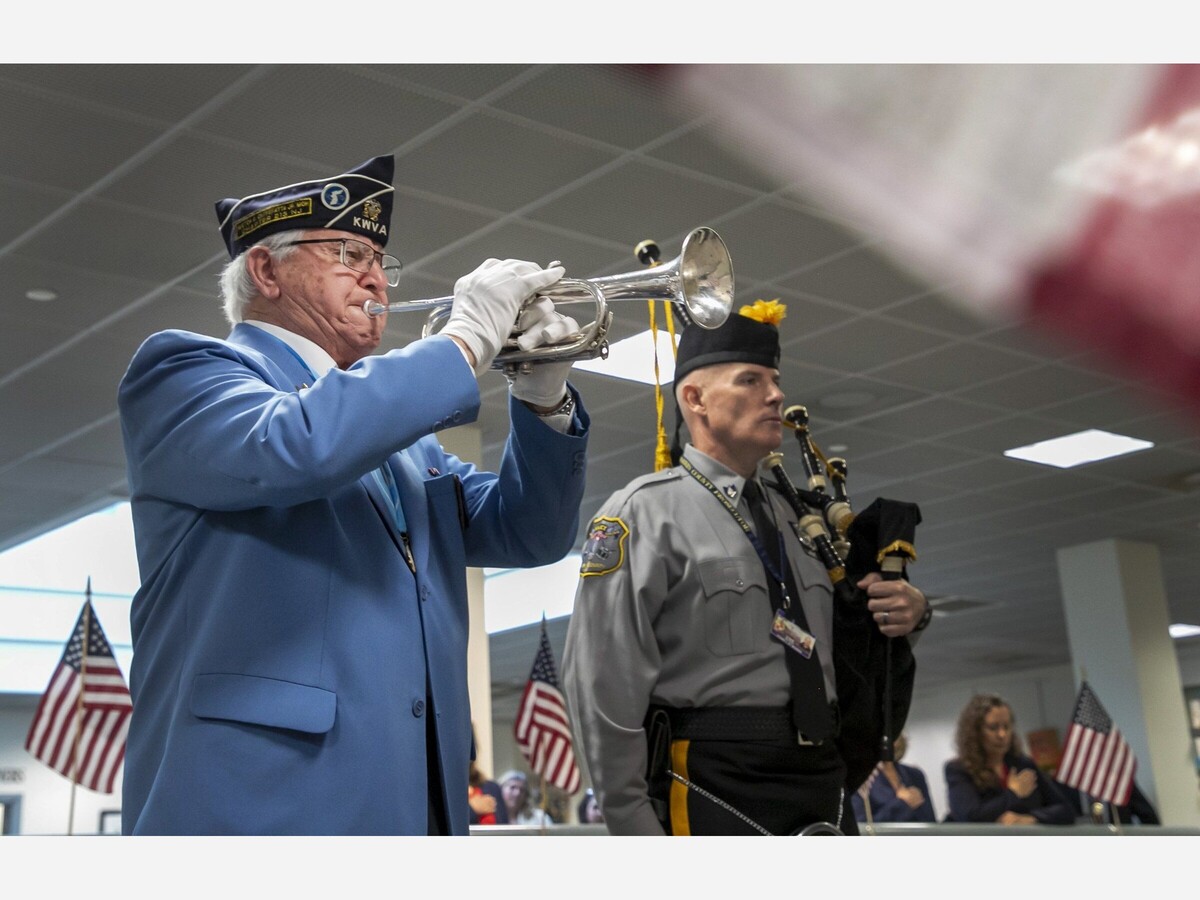 Playing Taps is Michael J. Del Vecchio, a Korean War Veteran and National Drum Corps Hall-of-Fame bugler. At right is bagpiper Morris County Prosecutor’s Office Chief Robert McNally.The program opened with a bagpipe processional by Chief Robert McNally of the Morris County Prosecutor’s Office as the Morris County Sheriff’s Office Joint Honor Guard presented the colors. Superior Court Assignment Judge Stuart Minkowitz, of the Morris-Sussex Vicinage, led the Pledge of Allegiance, and the Lakeview School of Denville Select Choir performed the National Anthem. An invocation was delivered by the Rev. Michael Muller of St. Peter’s Episcopal Church in Mountain Lakes.
