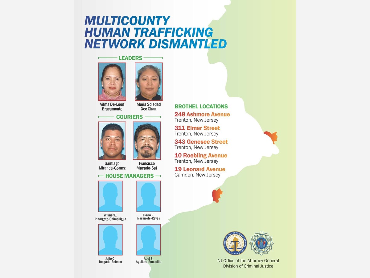 TRENTON, N.J. – Eight individuals have been charged with first-degree racketeering and human trafficking following a state-led investigation into a prostitution ring that allegedly operated brothels in Trenton and Camden, according to New Jersey Attorney General Matthew J. Platkin and the Division of Criminal Justice (DCJ).